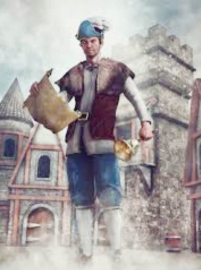 A town crier in a village is an appointed community member who delivers important news and announcements orally to residents, especially in communities where literacy is limited. They act as a traditional messenger for community leaders, sharing information on events, communal activities, and public decrees using instruments like a gong or drum to get people's attention.