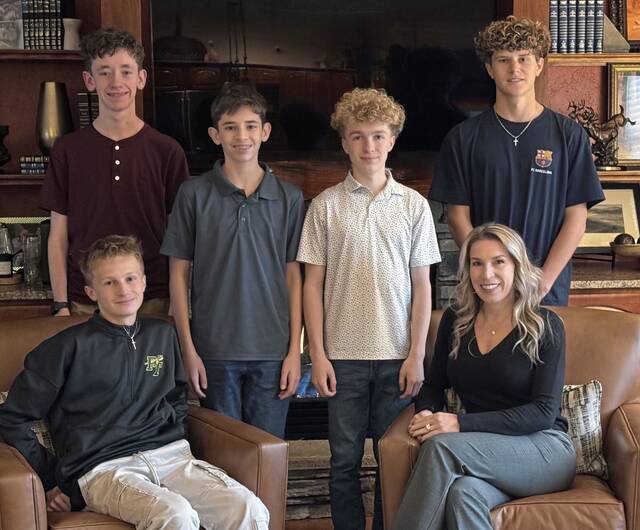 Penn-Trafford students Andrew Baker (back left), Biaggio Petrini, Bryce Porter, Santino Caruso and Brady Porter (front left) with alumnus Andrea Lonzo-Porter. . (Courtesy of Andrea Lonzo-Porter)
