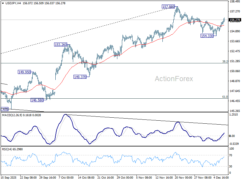 Intraday bias in USD/JPY stays mildly on the upside at this point. Corrective pullback from 157.88 could have completed at 154.33 already. Further rise should be seen to 157.88 and above. Firm break of 158.85 structural resistance will be a strong bullish sign, and should target a retest on 161.94 high next. For now, risk will stays mildly on the upside as long as 154.33 support holds, in case of retreat.