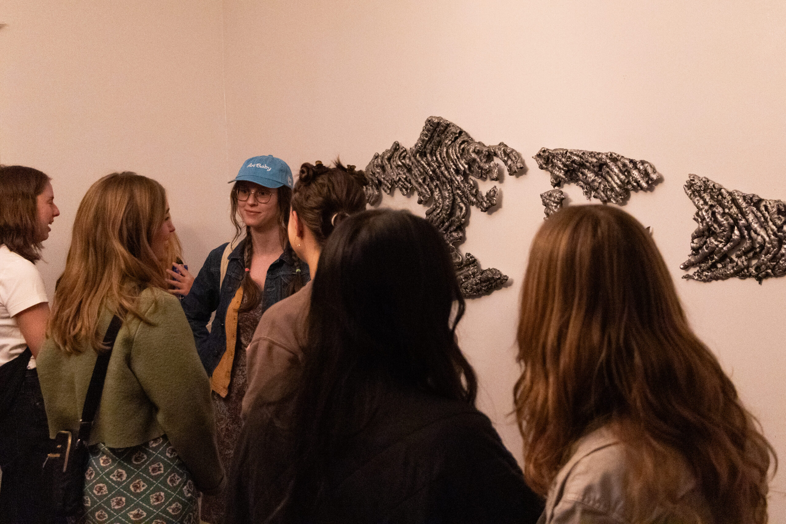 That lived-in chaos shaped everything. The exhibition featured works by graduate students Payton Landes, Levi Walker, Zach Johnson, Shiyao Fu, senior Robin Pyo, and the curators themselves. The pieces used materials such as metal, wax, brick, paper, and found wood, while the video installation room continued that handmade aesthetic with cinder blocks and scavenged scraps. Viewers moved through the rooms naturally, drifting between sculptures, prints, and glowing screens.